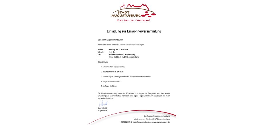 hiermit laden wir Sie herzlich zur nächsten Einwohnerversammlung ein:Dienstag, den 31. März 2026, 19.00 Uhr, Mehrzweckhalle im OT AugustusburgStraße der Einheit 19, 09573 Augustusburg